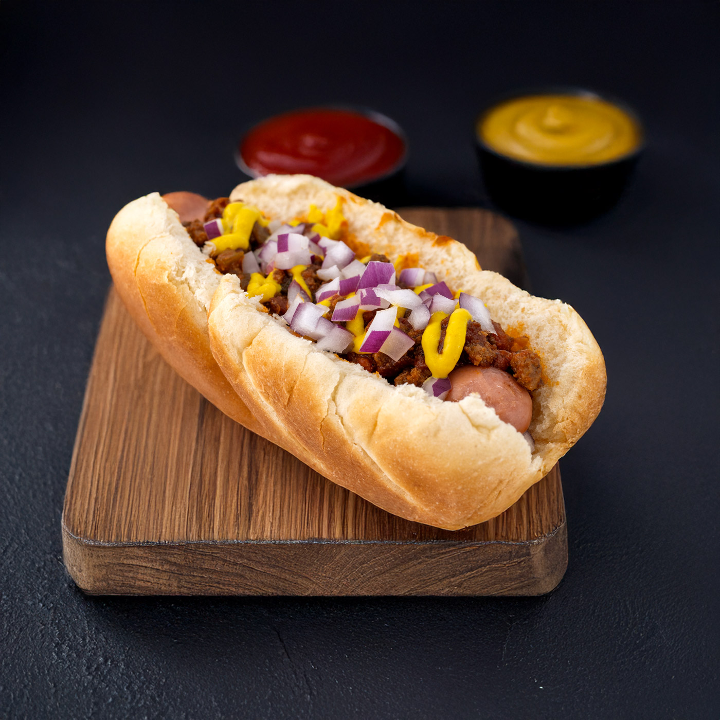 Old Fashioned beef & pork hotdog smothered in house made chili sauce and sprinkled with diced onions.