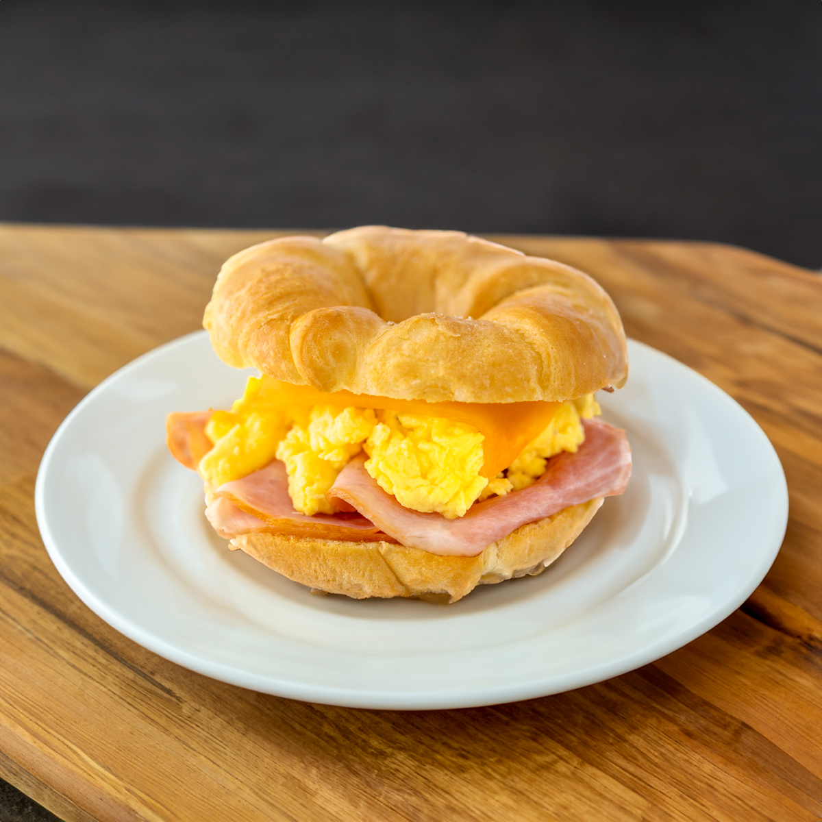 Savory ham, fluffy scrambled egg, and melted cheddar cheese served on a warm, flaky croissant.