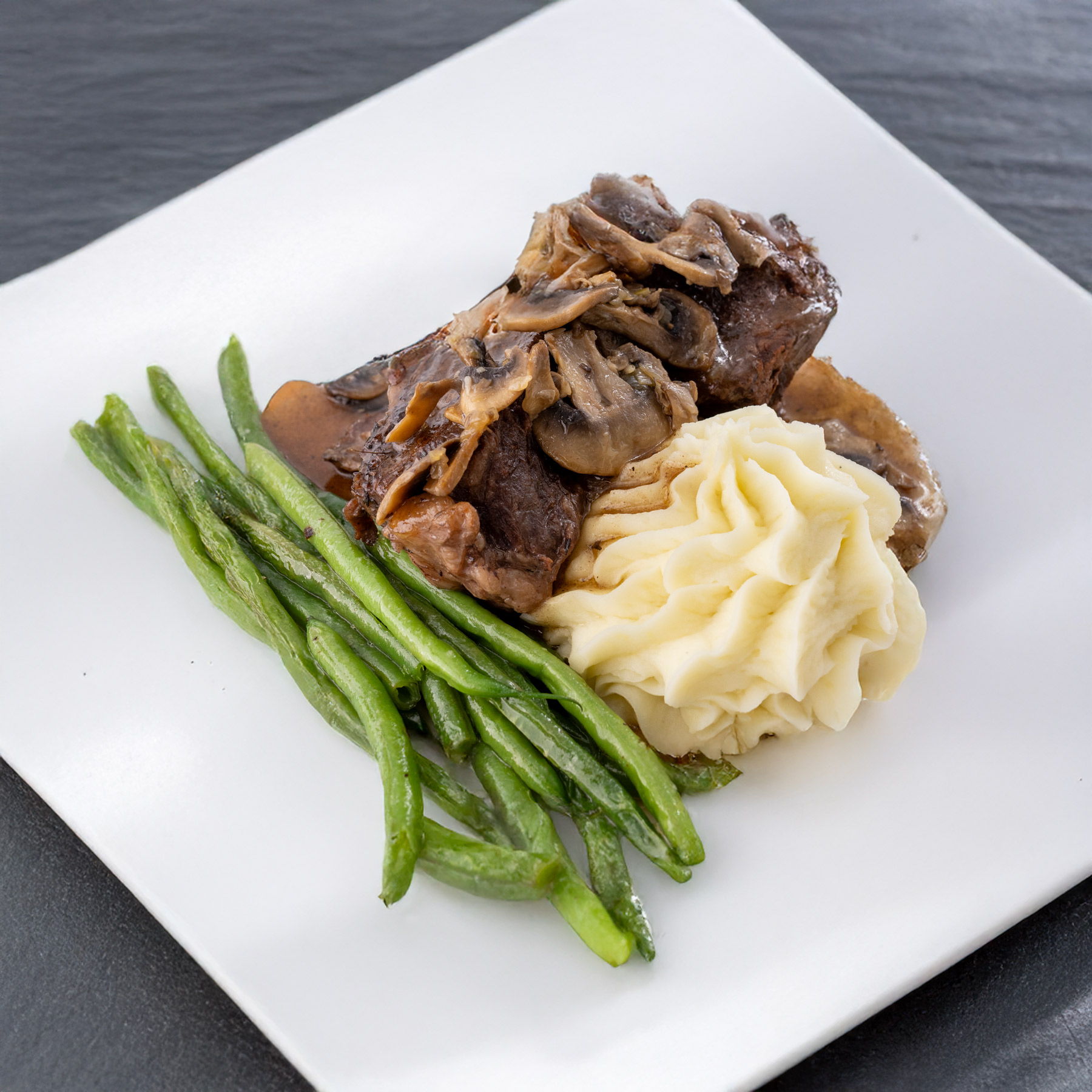 Tender braised beef in a rich red wine sauce, garlic mashed potatoes, buttery green beans, and sautéed mushrooms